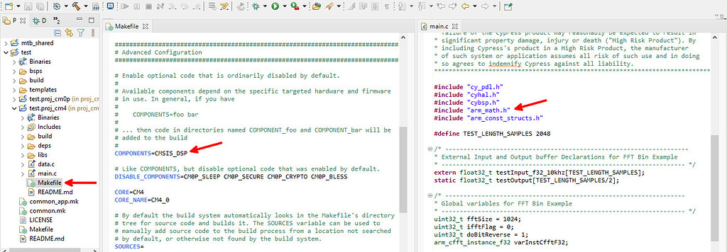 CMSIS_DSPライブラリの入っているディレクトリの中にfft.cmakeファイルがあるので、必要な定義を見つけたらmakefileのDEFINEに足せばOK!