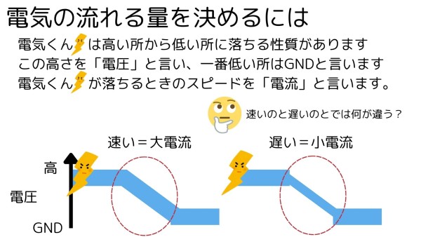 電気くんが落ちるスピード。 速いほど電流が大きい、ゆっくりなら電流が小さい。