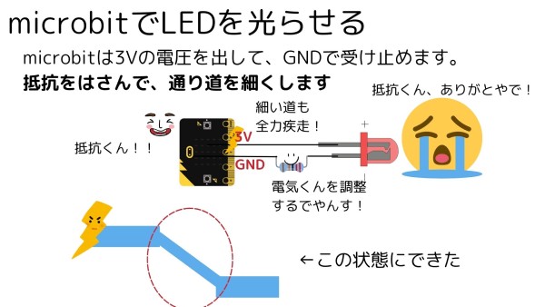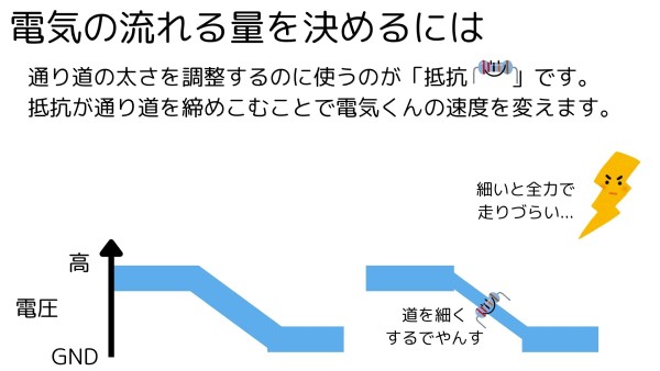 - 抵抗が大きい → 道が細くなる → 電気くんがゆっくり進む → LEDは暗くなる