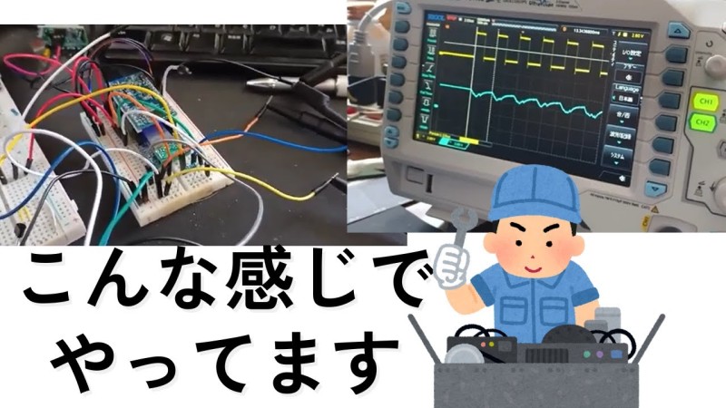 なので組込みエンジニアの仕事ってプログラム作るっていうところにフォーカスされがちなんですけど、実際はこうやって電気信号を値を見るならテスターだし、波形で見る時間分解能を上げて見るんだったらオシロだしっていう感じで、こういった機器も使いながら仕事をします。