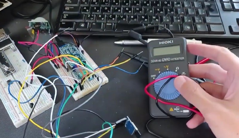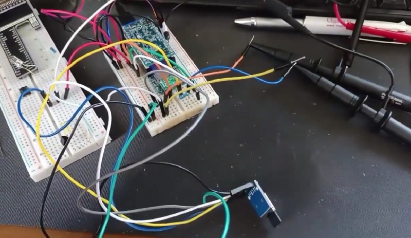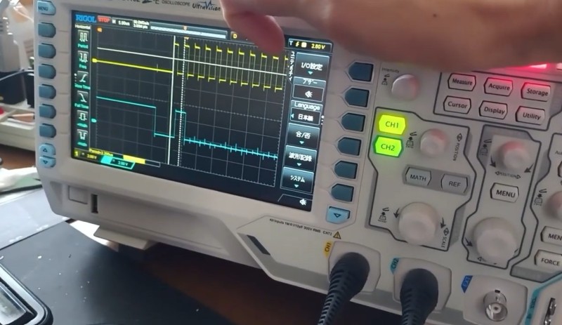 いくらプログラムをデバッグしてもこれに気づけなくて、これSPIという通信でマイコンとSDカードが通信していて、こういうテスターですね。これで電圧とか見て動いているのかなというのを見るわけです。