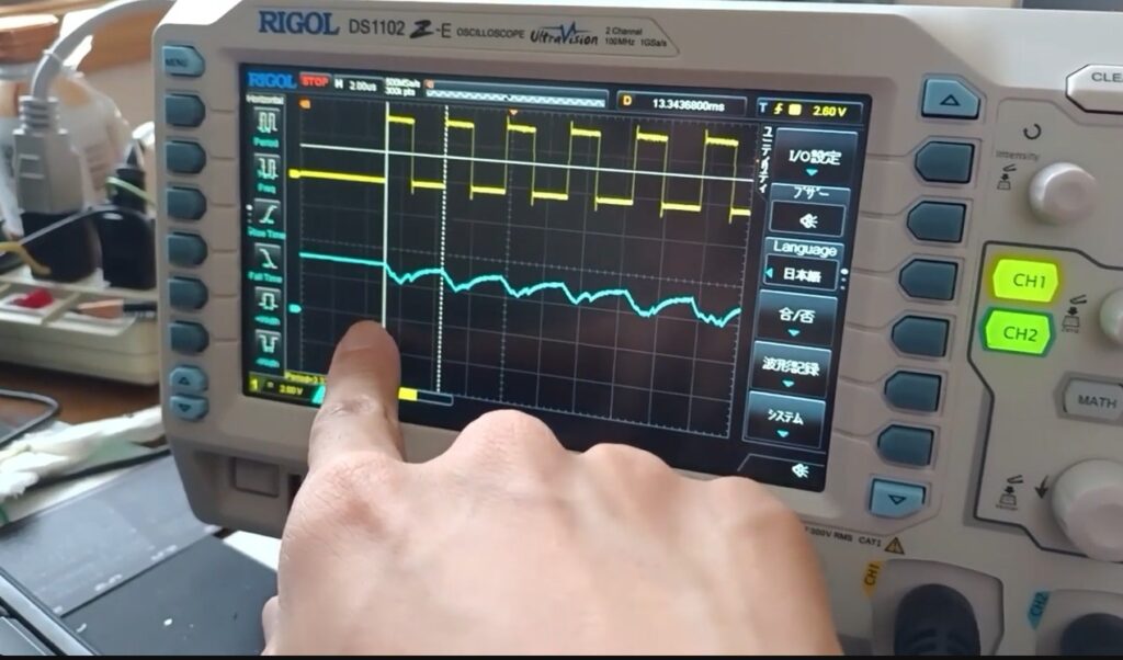 実際、今はこうやって出来合いのものでやってますけど、一から作るような会社だと、ここにハンダゴテがあって、もうこんな所じゃないぐらいピンピンピンピン線が出てて、安いやつなので2個しか信号取れないんですけど、4チャンぐらいのオシロを使いながらどういう波形が出てるかなっていうのを見ながら進めていくって感じですね。