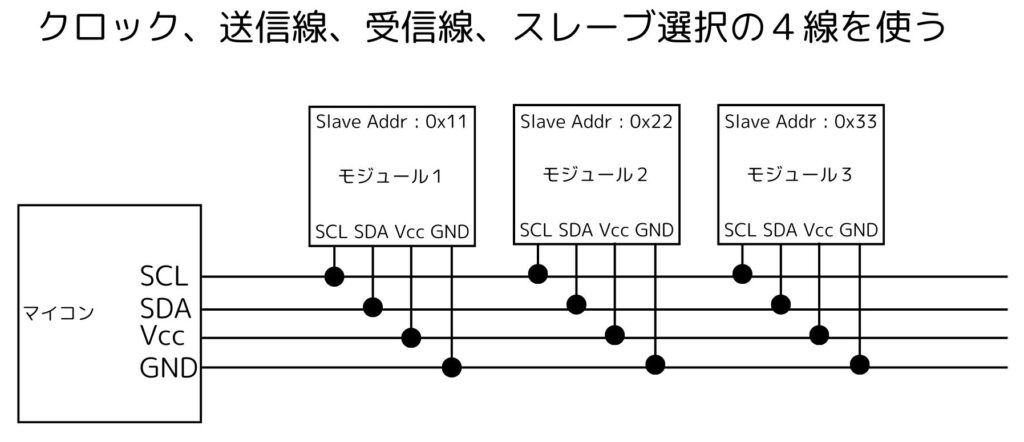 • 配線が4本だけで済む(特にSCLとSDAの2本で通信可能)