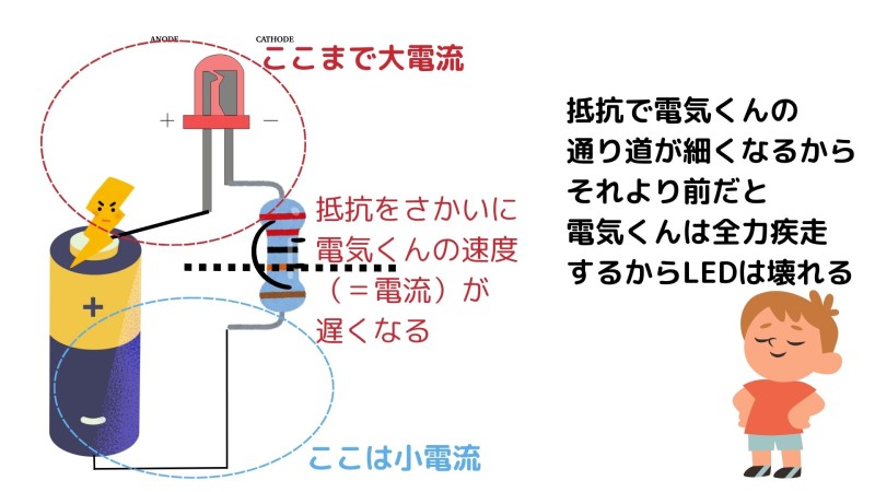 イメージとしては、 「太い道 → LED → 細い道(抵抗)」 という感じですね。