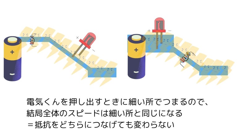 • 電気くんはギッチギチに詰まっており、全体が細い道(抵抗)に合わせて動く