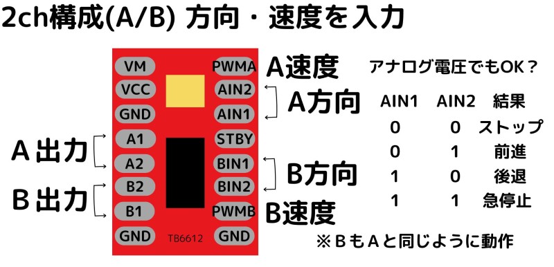 このモータードライバーは、2チャンネル(A・B)のモーター制御が可能です。