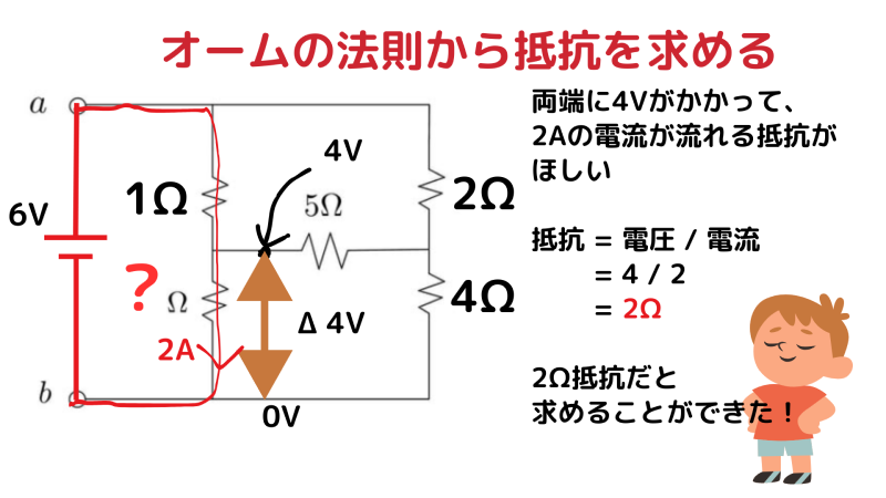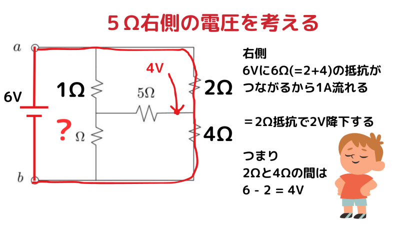 - 右側の 5Ω の端子電圧:6V − 2V = 4V