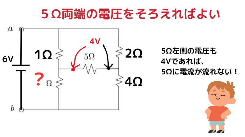 5Ω に電流を流さないためには、 左側の電圧も 4V にする必要があります。