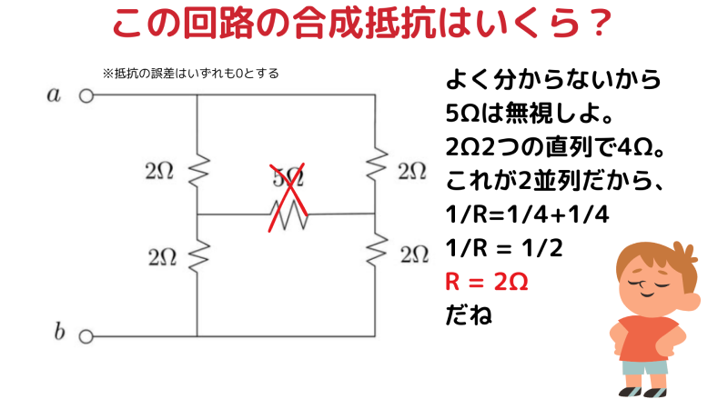 【電気回路の問題】中央の5Ωがあるのに無視できる?合成抵抗の考え方を解説
