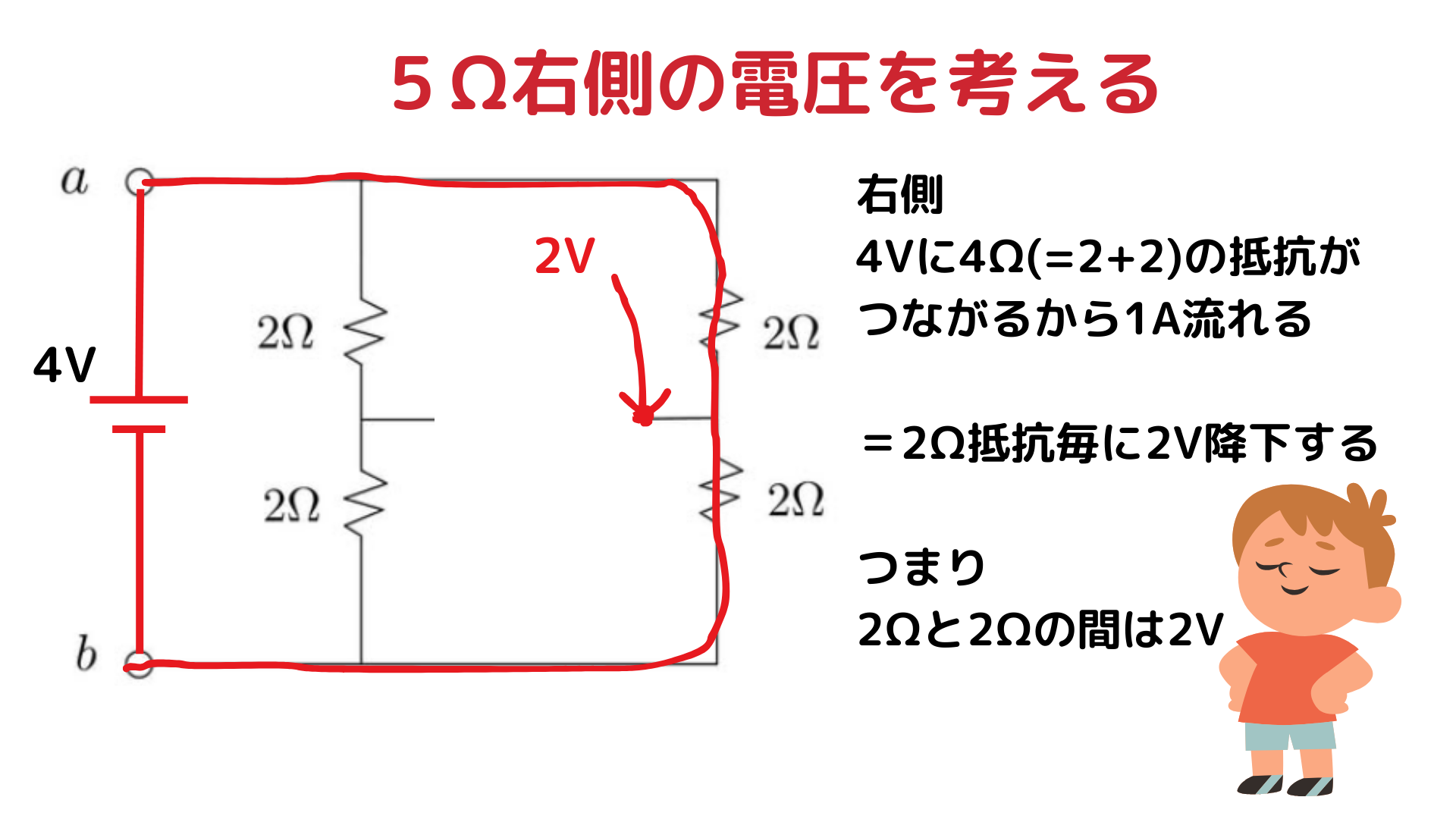 つまり、右側の 2Ω と 2Ω の間の電位は 2V になります。