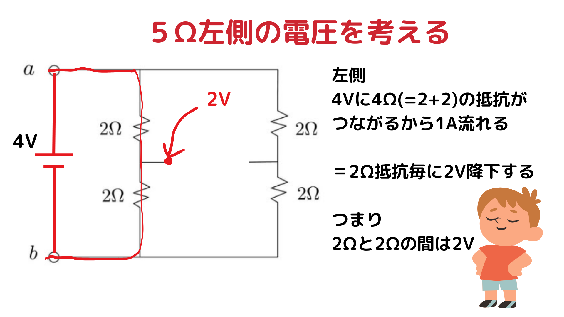 左右の中点はどちらも 2V。 つまり、5Ω の両端は 2V – 2V = 0V。
